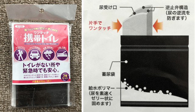 こういった、携帯トイレは災害の時など、水道が止まってしまったりした場合などにも利用できて便利ですので、いくつか購入して備蓄しておくといざという時に役立つかも。